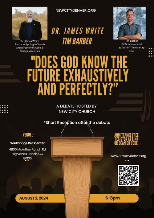 Join us for a debate between Dr. James White and Tim Barber regarding Open Theism and the question, "Does God Know the Future Exhaustively and Perfectly?", hosted by New City Church. The debate will take place from 6-8 pm at the Southridge Recreation Center, Wildcat Auditorium at 4800 McArthur Ranch Rd, Highlands Ranch, CO 80130. There will be a short reception after the debate from 8-8:30pm.